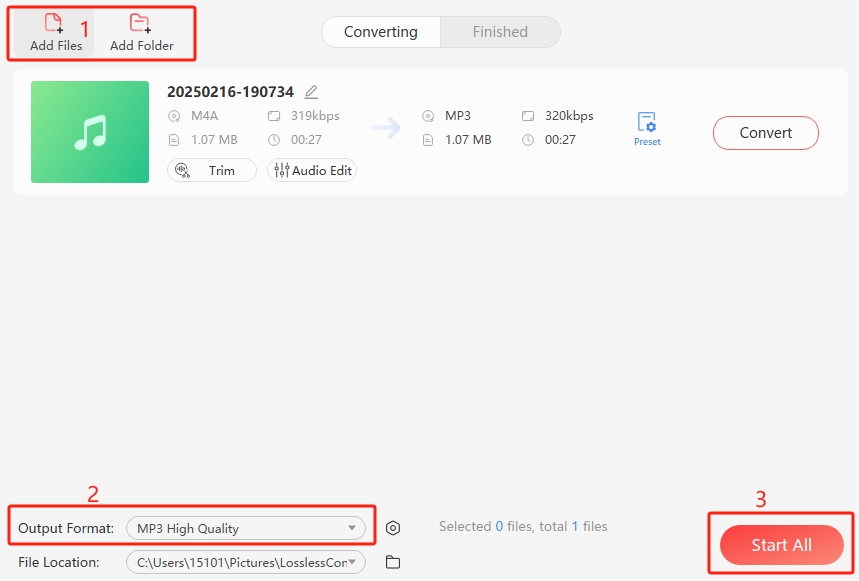 Step 1 Open LosslessConverter and choose "Audio Converter", drag any format audio file to the start area, or click "Add Files", "Add Folder" to load files.