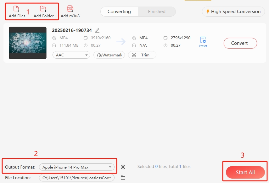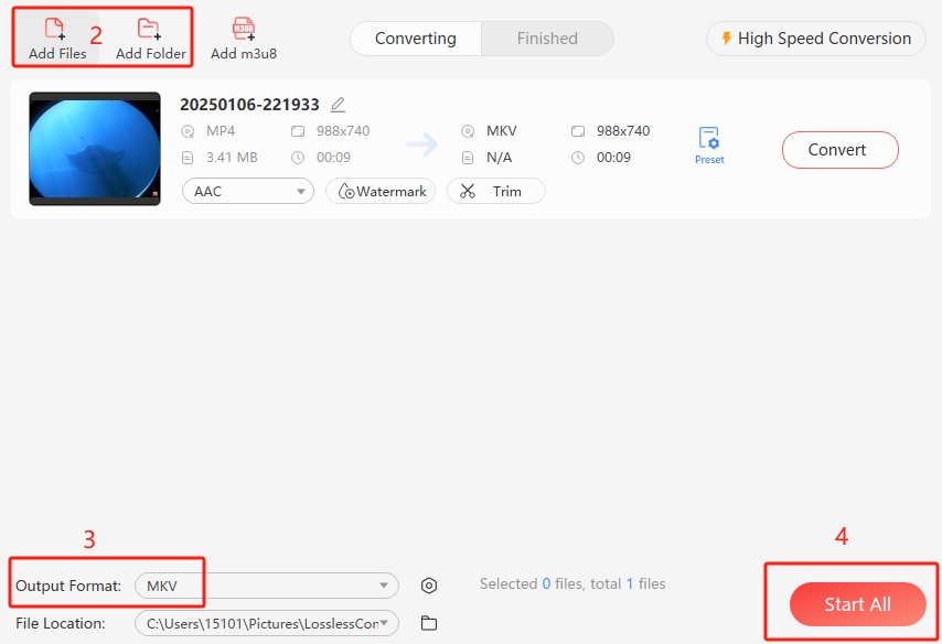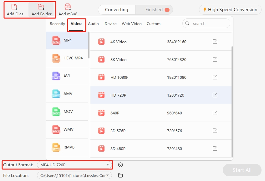 Step 1 Open LosslessConverter and choose "Video Converter", drag any format video file to the start area, or click "Add Files", "Add Folder" to load files.