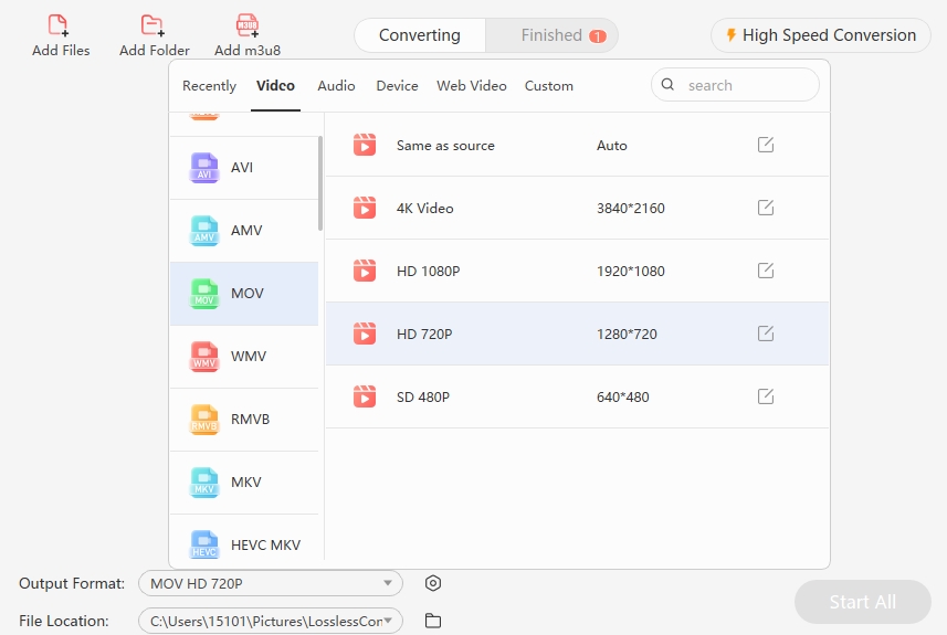 Step 2 Click the "Output Format" option, click the "Video" option, You can directly choose the resolution you need according to the preset resolution of different video formats.