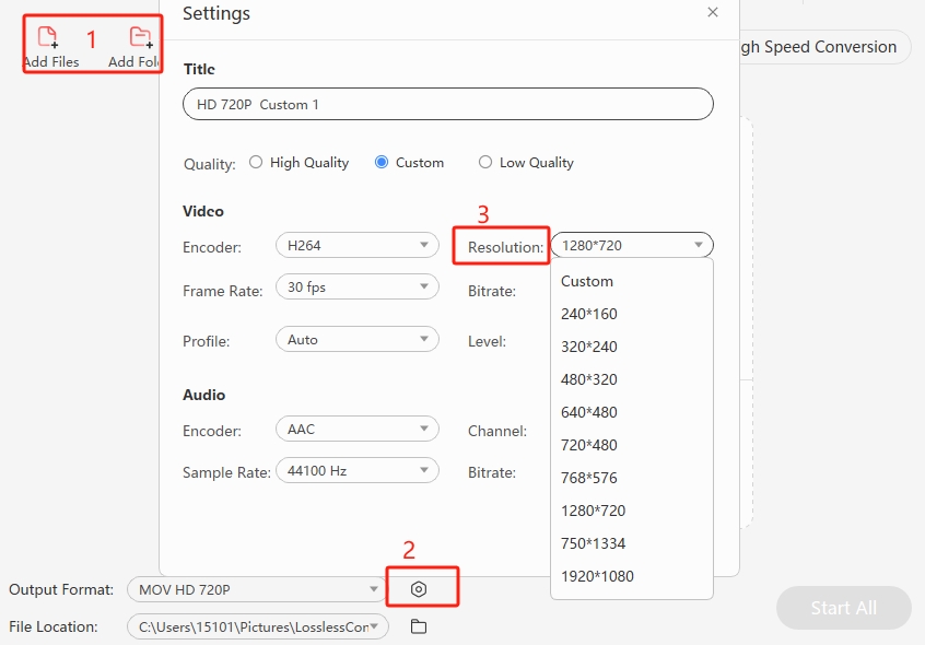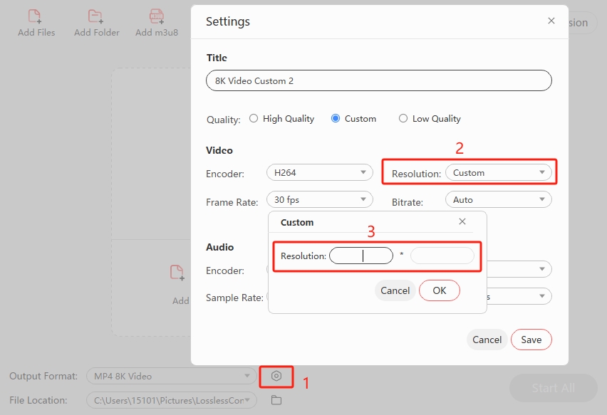 Select "Video Converter", then click the settings icon next to "Output Format", select the "Resoluiton" drop-down box in the settings panel, click "Custom", manually enter the customized resolution and click "OK".